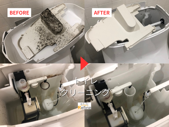 おそうじリファインでは、専用洗剤とプロの分解洗浄で、便器・タンク外側・便座裏・ウォシュレット部分など、手の届かない部分まで徹底的にクリーニング!